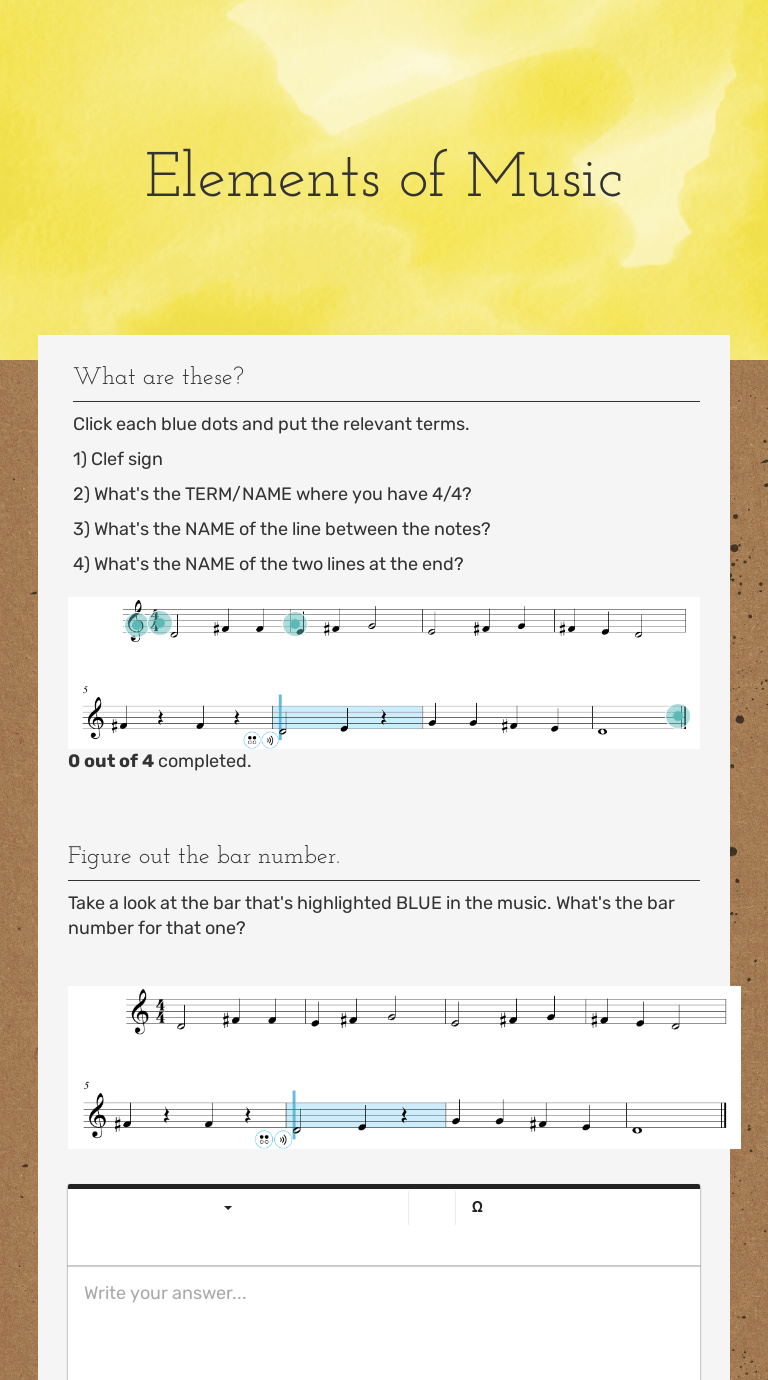 He is as thin as a rail. Class discussion focused on these paintings will help students understand how artists use color to convey atmosphere and mood. You will need a pen, colored pencils, and group labels. The bar of soap was a slippery eel. A work of fiction is always told by a narrator. I have put together a range of free worksheets from beginners worksheets covering topics such as pitch, note lengths, rhythms and treble clef to more advanced topics such as bass clef, intervals and … She toyed with the idea. Feel free to download these pdf worksheet s and answer sheets by clicking on the links below. You will need a pen, colored pencils, and group labels. A work of fiction is based on real people and real events. The elements of fiction true/false indicate whether the statement is true or false. Paste the completed table in your notebook once you are finished. The bar of soap was a slippery eel. Poetry group 6 (b) rabiatul hamidah (a1b214041) rizki amalia (a1b214049) 2. 12.01.2017 · definition, elements, types, and genres of poetry 1. A short story is a long work of nonfiction. A work of fiction is always told by a narrator. Simile and metaphor student worksheet simile examples: Only borrow a few colors at a time because these materials must be shared with the entire class. Paste the completed table in your notebook once you are finished. Simile and metaphor student worksheet simile examples: She toyed with the idea. A work of fiction is always told by a narrator. Feel free to download these pdf worksheet s and answer sheets by clicking on the links below. A short story can be read in one sitting, has one main plot and centers around a single conflict. Follow the directions one step at a time to accurately label and color the periodic table. The willow's music is like a soprano. Learn about the major elements of jazz, swing and syncopation, as … She is as sweet as candy. • rhythm in writing acts as beat does in music. A work of fiction is always told by a narrator. My dad is a bear. She slept like a log. Only borrow a few colors at a time because these materials must be shared with the entire class. They might be stressed for longer period of time. They will then test their color expertise by completing a downloadable worksheet and coloring a photograph of … The willow's music is like a soprano. They might be stressed for longer period of time. Students will be introduced to one of the basic elements of art—color—through analysis of works of art by monet, matisse, and kandinsky. 11.10.2021 · explore more about the elements of orchestral music, including the instrument sections, the member roles, and the format. The bar of soap was a slippery eel. A work of fiction is always told by a narrator. The elements of fiction true/false indicate whether the statement is true or false. Simile and metaphor student worksheet simile examples: The bar of soap was a slippery eel. 11.10.2021 · explore more about the elements of orchestral music, including the instrument sections, the member roles, and the format. Learn about the major elements of jazz, swing and syncopation, as … Paste the completed table in your notebook once you are finished. I have put together a range of free worksheets from beginners worksheets covering topics such as pitch, note lengths, rhythms and treble clef to more advanced topics such as bass clef, intervals and … My dad is a bear. Follow the directions one step at a time to accurately label and color the periodic table. A short story is a long work of nonfiction. Students will be introduced to one of the basic elements of art—color—through analysis of works of art by monet, matisse, and kandinsky. They might be stressed for longer period of time. Elements Of Music Worksheet : Acoustics And The Elements Of Music Is Your Name And Today S Date At The Top Of The Worksheet Now Ppt Download -. She slept like a log. Simile and metaphor student worksheet simile examples: He is as thin as a rail. My dad is a bear. Bob runs like a deer.