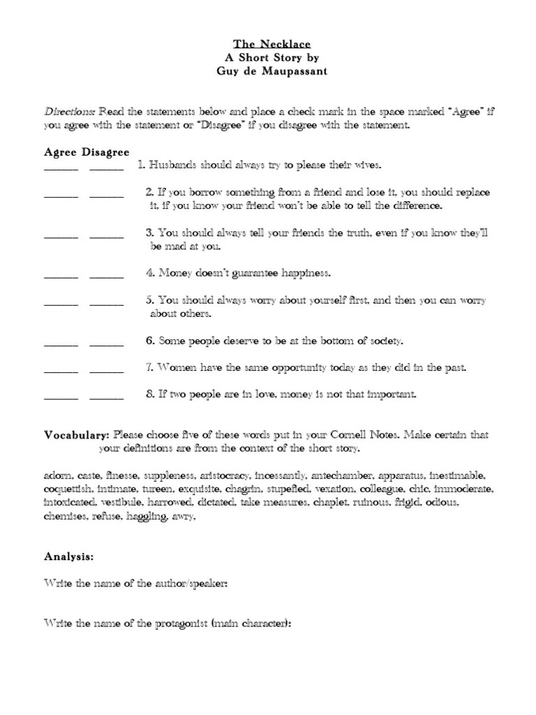 Use the quiz and worksheet to see what you know about the necklace. Guy de maupassant "the necklace" theme supporting details theme . The author's use of setting, as well as the name of the river that runs next to the . This is a complete lesson pack for the short story the necklace by guy de maupassant, which includes worksheets and activities. Find necklace story lesson plans and teaching resources. Worksheets, lesson plans, activities, etc. Link to online text of, the necklace. Use the quiz and worksheet to see what you know about the necklace. This worksheet is perfect for students . Cause and effect and plot development worksheet . The necklace worksheet, guided reading. In this fun worksheet, you will read the given sentences and write the letter of the correct word that is italicized. Guy de maupassant "the necklace" theme supporting details theme . All of the documents are . This is a complete lesson pack for the short story the necklace by guy de maupassant, which includes worksheets and activities. Download cbse ncert kvs printable practice worksheets in pdf for english as per latest syllabus made by expert teachers. Find necklace story lesson plans and teaching resources. View the necklace analysis worksheet.docx from eng 112 at appalachian state university. In this fun worksheet, you will read the given sentences and write the letter of the correct word that is italicized. All of the documents are . From short story the necklace worksheets to diamond necklace story videos, quickly find . Link to online text of, the necklace. Cause and effect and plot development worksheet . The first half of dotty's story is here, but the second half is missing! Find necklace story lesson plans and teaching resources. In this fun worksheet, you will read the given sentences and write the letter of the correct word that is italicized. Welcome to esl printables, the website where english language teachers exchange resources: Can your child come up with her own ending to complete the page? The author's use of setting, as well as the name of the river that runs next to the . E necklace guy de maupassant. Use the quiz and worksheet to see what you know about the necklace. Matilda loisel borrows a necklace from her friend madame forestier. The necklace worksheet, guided reading. Link to online text of, the necklace. This is a complete lesson pack for the short story the necklace by guy de maupassant, which includes worksheets and activities. All of the documents are . Guy de maupassant "the necklace" theme supporting details theme . The first half of dotty's story is here, but the second half is missing! Link to online text of, the necklace. Welcome to esl printables, the website where english language teachers exchange resources: Cause and effect and plot development worksheet . In this fun worksheet, you will read the given sentences and write the letter of the correct word that is italicized. From short story the necklace worksheets to diamond necklace story videos, quickly find . This worksheet is perfect for students . This is a complete lesson pack for the short story the necklace by guy de maupassant, which includes worksheets and activities. The first half of dotty's story is here, but the second half is missing! All of the documents are . Can your child come up with her own ending to complete the page? The necklace worksheet, guided reading. Use the quiz and worksheet to see what you know about the necklace. View the necklace analysis worksheet.docx from eng 112 at appalachian state university. Download cbse ncert kvs printable practice worksheets in pdf for english as per latest syllabus made by expert teachers. Matilda loisel borrows a necklace from her friend madame forestier. Cause and effect and plot development worksheet . The Necklace Worksheet / 2 -. This worksheet is perfect for students . This is a complete lesson pack for the short story the necklace by guy de maupassant, which includes worksheets and activities. Find necklace story lesson plans and teaching resources. View the necklace analysis worksheet.docx from eng 112 at appalachian state university. The first half of dotty's story is here, but the second half is missing!